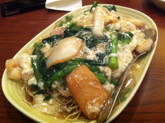 底下有乾煎過的米粉跟炒過的河粉 淋上滑嫩的醬汁 相當推薦的一道