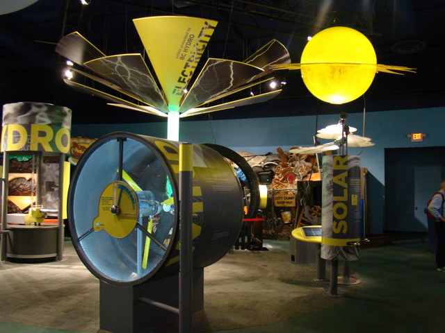 展示了各種關於風力 水力 太陽能 ..等 由機器展示其行成及可供電力